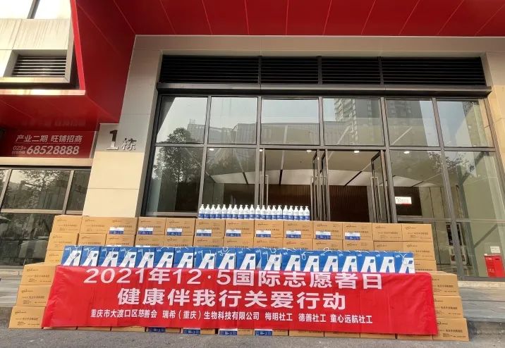 12月2日上午重庆市大渡口区慈善会、大渡口区社会组织实践园联合瑞希(重庆)生物志愿服务队、区梅明社工、区德善社工、区童心远航社工、区孝诚社工开展2021年12.5国际志愿者日健康伴我行关爱行动,向大渡口区17家中小学校、26家医院及镇街卫生服务站捐赠价119800元抗病毒喷雾(免洗手消毒凝胶)。