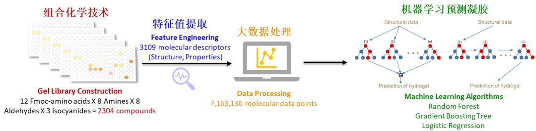 在这项研究中,瑞希生物人员利用组合化学技术快速创建了超过两千种结构差异的水凝胶文库,通过计算这些化合物的上千种拓扑和物理化学特征参数,实现了利用机器学习预测水凝胶的形成。研究人员实现了将凝胶的物理化学结构特征与其自组装行为联系起来,加速了用于生物医学用途的新型自组装水凝胶结构的设计。